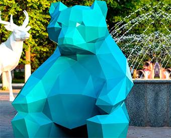 這一不銹鋼大熊貓雕塑通過幾何雕塑的形式,又上以亮藍色的顏色,將日常圓滾滾的大熊貓的不同一面展現了出來。這樣的幾何不銹鋼動物雕塑十分適合放在室內外空間中用作裝飾。幾何雕塑作為一種非具象雕塑造型語言,外觀簡約而又形象。在視覺上,能夠簡單而又直接地表達藝術。